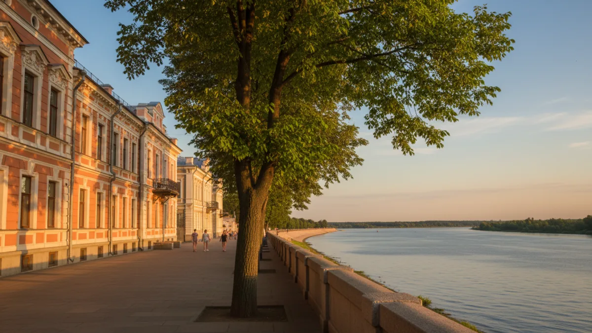 Верхневолжская набережная — один из немногих нижегородских адресов, где панорама Волги и плотная историческая застройка существуют бок о бок. Маршрут начинается у Георгиевской башни Кремля и заканчивается у площади Лядова, протяжённость пешего пути — около 2,5 километра. Лучшее время для прогулки — утро в будний день или поздний вечер летом, когда набережная почти пустая и свет особенно хорош для осмотра фасадов.